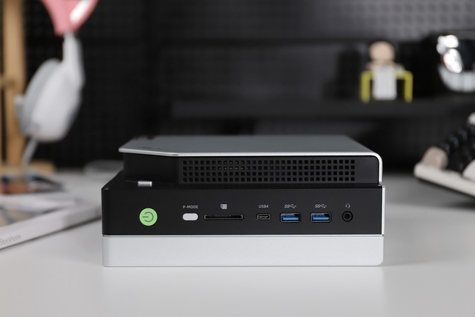 机身前面板除了一个圆形绿色的电源按键,还专门设计了一个P-Mode性能模式切换的按键,为用户带来更加灵活高效应对多场景应用的需求。此外,前面板还提供了 1 个 SD 卡插槽,1 个Type-C USB4,2 个USB 3.2,1 个 3.5mm 耳机/麦克风插孔。