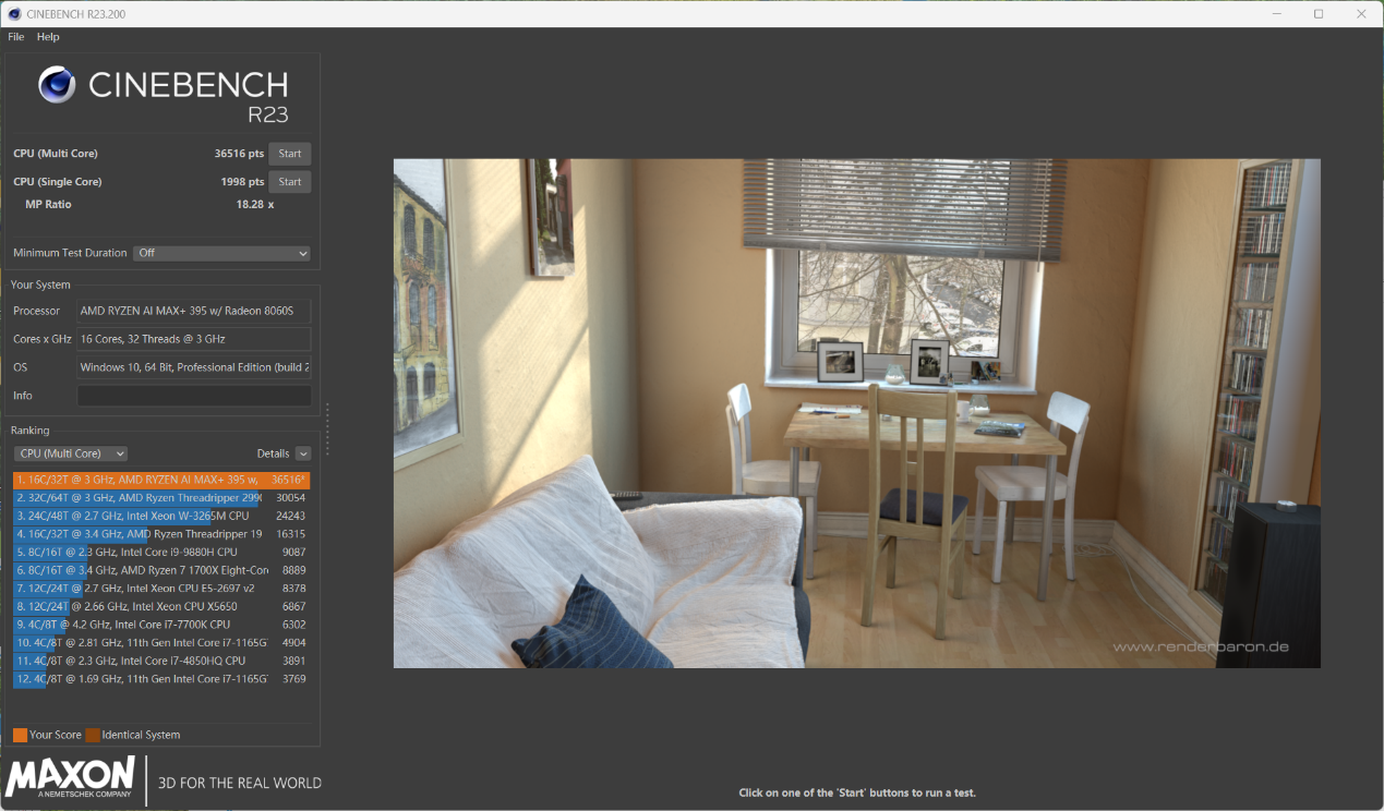 在CINEBENCH R23 的跑分中,AMD锐龙 AI Max+ 395 处理器的多核得分达到了36516 pts,单核得分1998 pts 的优秀成绩,处理器性能表现足够强悍。