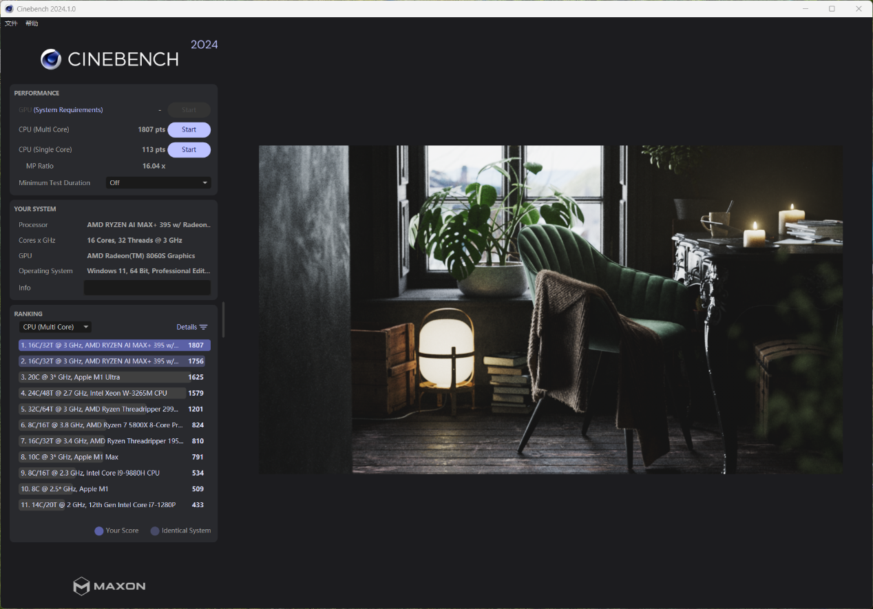 CINEBENCH 2024增加了对内存的占用、计算的工作量等,以确保基准测试能匹配当代创意项目的复杂性。结果可见,锐龙 AI Max+ 395 处理器在CINEBENCH 2024的测试中,多核得分1807 pts,单核得分 113 pts,依然表现非凡。