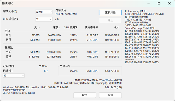 7-Zip内置的基准测试,可以用于评估CPU多线程性能,测试结果可见,压缩速度达到了148189 KB/s,解压缩速度2074309 KB/s,总体评分高达176.875 GIPS,这样的成绩显然很“恐怖”。