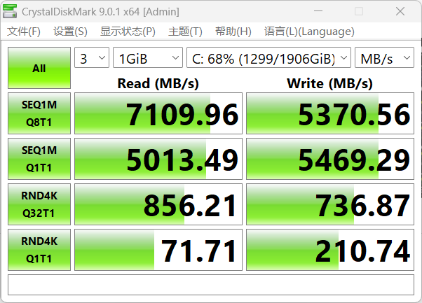 SSD的读写速度方面,实测的顺序读取速度为 7109.96 MB/s,写入速度为 5370.56 MB/s,速度飞快,尤其是4K随机读写的速度很高。