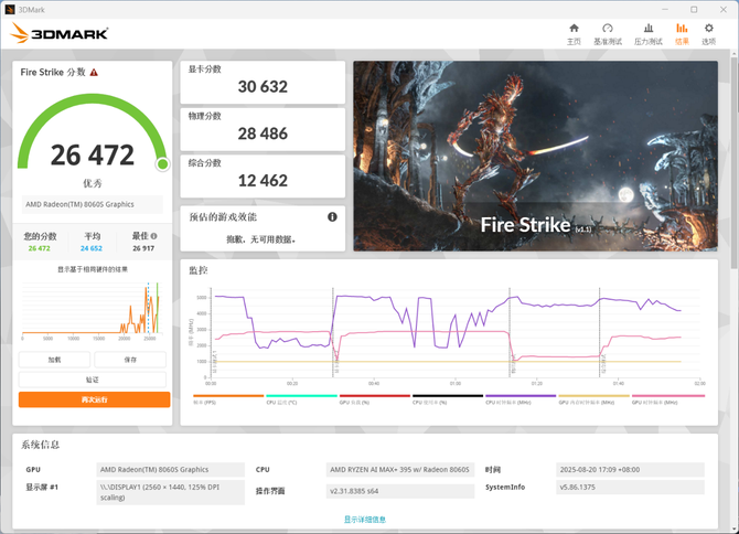 Fire Strike 测试中,显卡得分30632,综合得分 26472。