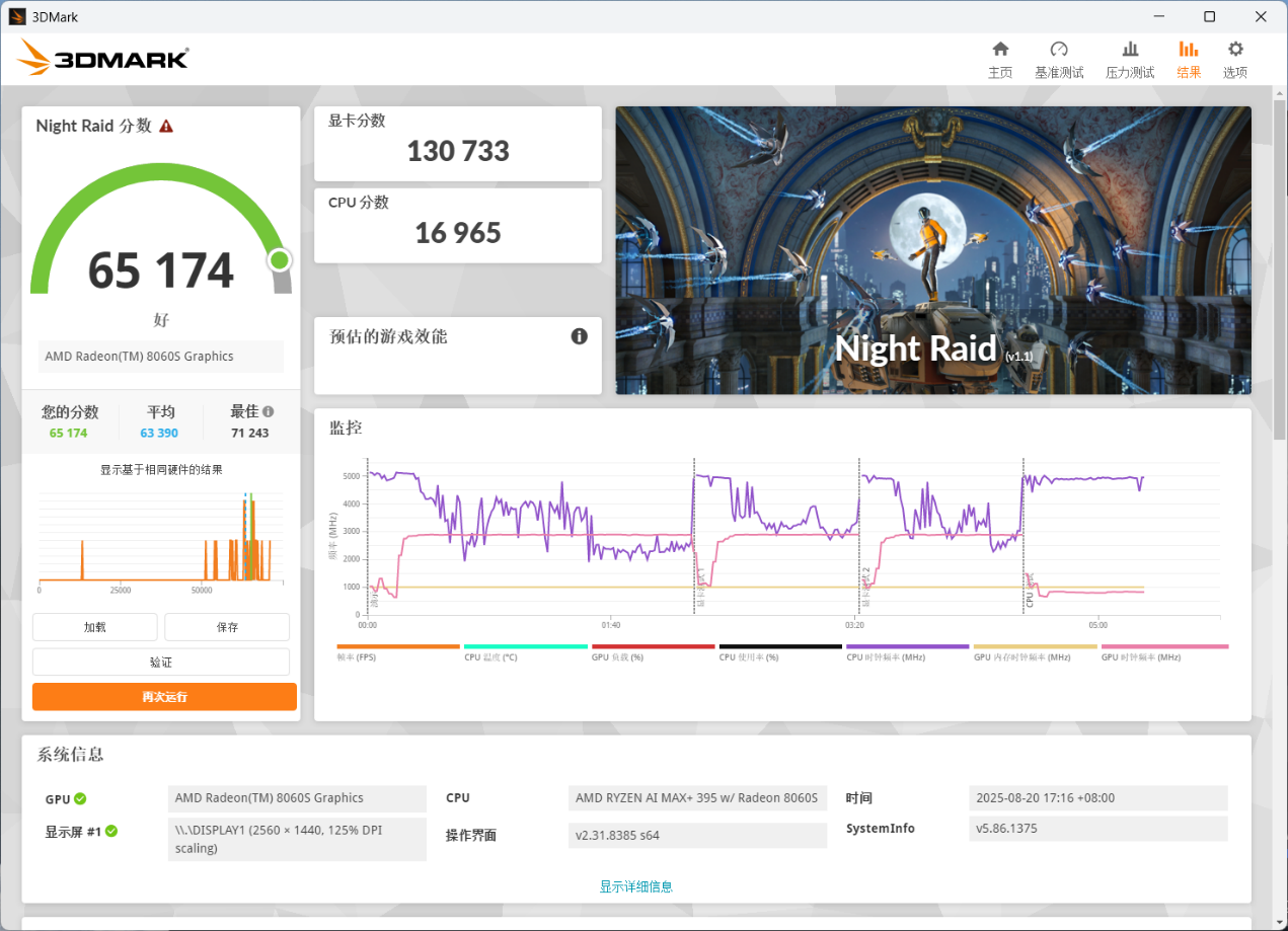 Night Raid 的测试中,显卡得分130733,综合得分65174。