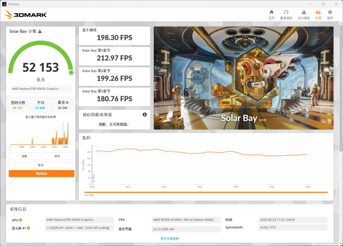 Solar Bay 光线追踪测试,显卡 198 FPS,三个章节均在180 FPS以上。