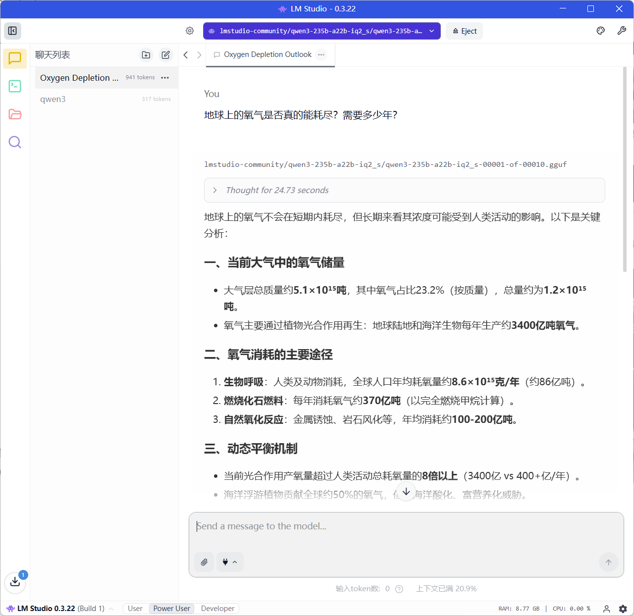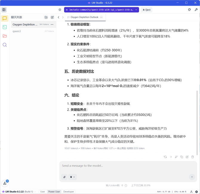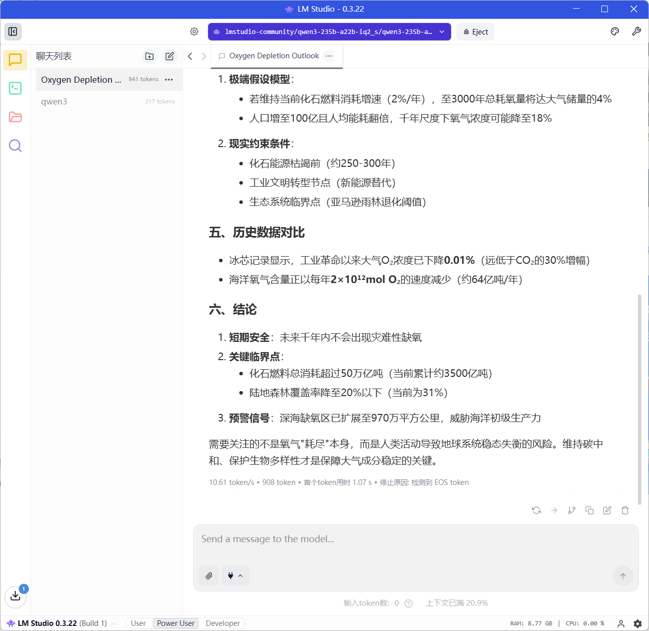 来验证一下。我们输入 “地球上的氧气是否真的能耗尽?需要多少年?”,这显然也没有固定的答案,所以 AI 给出的答案包括了当前大气中的氧气储量、主要的消耗途径、动态平衡的机制等,当然不会在可见的短期内耗尽了。来看看运算的结果:输出 908 token,用时 10.61 token/s ,首个 token 用时 1.07s。