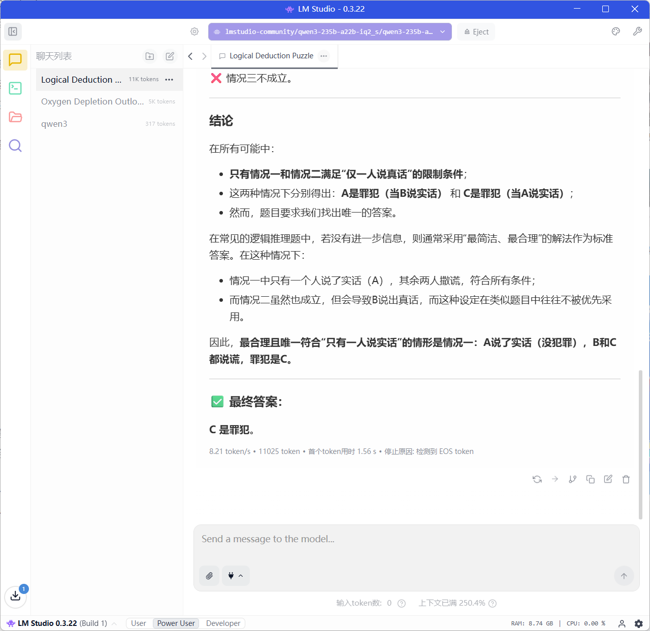 实际运行阶段,通过 LM Studio 平台完成模型加载与对话任务初始化:启动 LM Studio 后,加载经优化的 Qwen3-235B-A22B-IQ2_S 模型文件,系统自动调用锐龙 AI Max+ 395 的异构算力资源与预配置的内存分配策略,待模型加载完成后即可启动交互式对话任务,实现全尺寸 235B 参数模型在 AI PC 端的流畅运行,突破传统终端设备无法承载超大规模模型本地部署的技术限制。