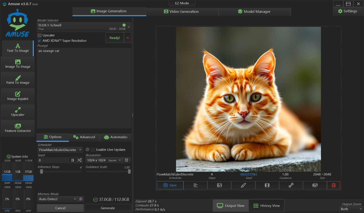 作为 AMD 的合作伙伴,Amuse 对 AMD 平台的 AI 性能进行了深度挖掘与优化。特别是在搭载锐龙 AI 处理器的设备上,其性能表现尤为突出。以极摩客EVO-X2所搭载的锐龙 AI Max+ 395 处理器为例,在使用 Amuse 进行文生图时,软件能够充分利用处理器的统一内存架构以及强大的计算单元。同时,Amuse 支持 AMD XDNA Super Resolution 功能,该功能允许利用 AMD 平台 NPU 的能力,对生成的图片进行超分处理,将分辨率提升至 2 倍。例如,生成一张初始分辨率为 1024×1024 的 “一只橘猫” 图片,在开启超分功能后,输出分辨率可达 2048×2048,且生成过程中,CPU、GPU、内存的资源调度分配合理。最终耗时仅 28.7s ,展现出高效的运算能力与图像生成效率。