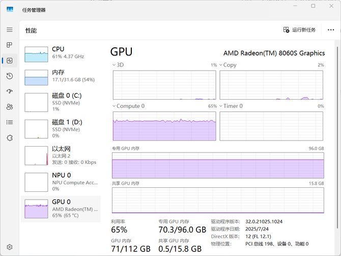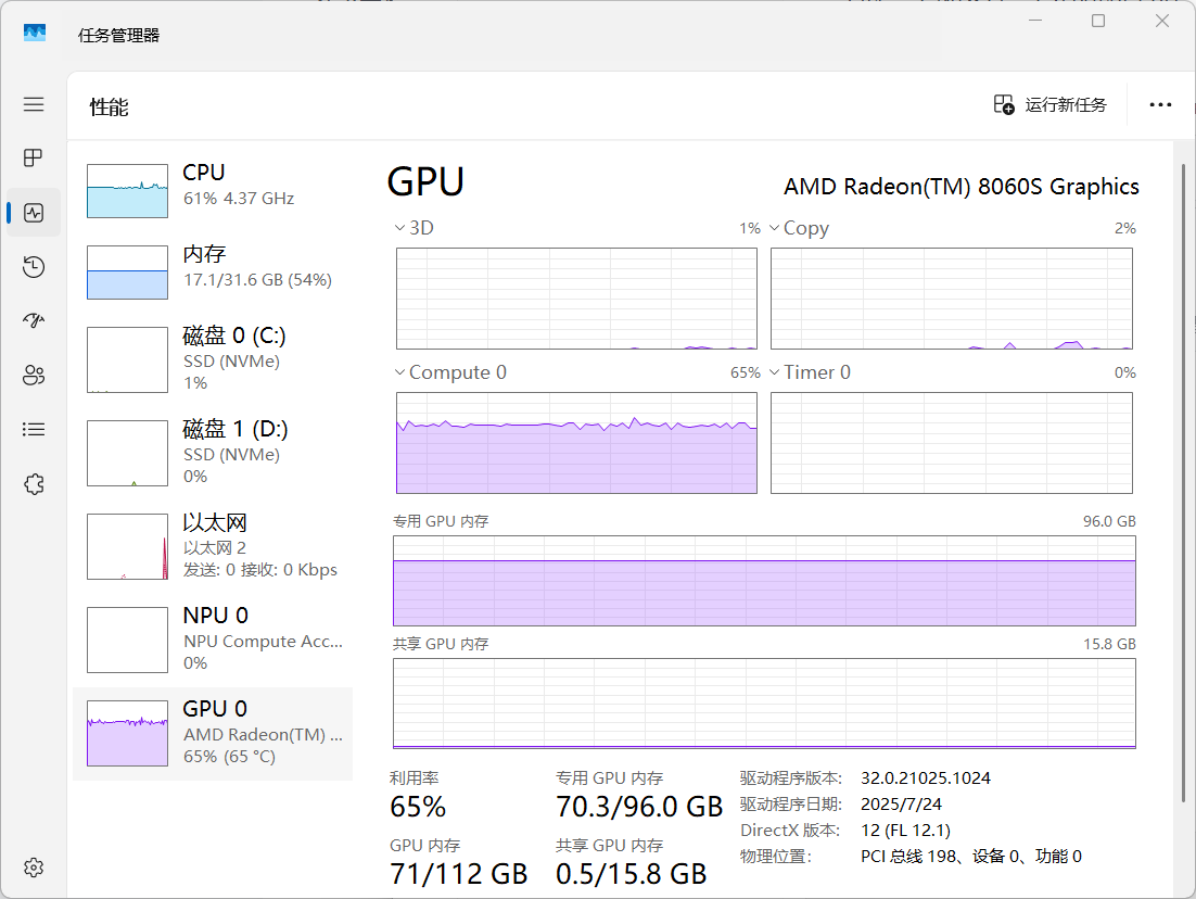 过去,像 70B、32B 这种级别的语言模型,或者像 Flux 这样的图像生成模型,基本只能靠动辄几万块的云服务器来支撑运行。但 AMD锐龙 AI Max+ 395 算力强、内存大,支持统一内存技术,可以将 96GB 内存划归显存使用,还能灵活调度 CPU、GPU 和 NPU,让很多原本只能在云上跑的模型,如今在本地也能稳定高速地运行。而且对 AI 初学者或者入门级开发者来说,这也意味着门槛大幅降低 —— 以前不敢想的事,现在一台小主机就能完成,关键价格也能接受。