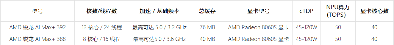 最新的锐龙 AI Max+ 系列处理器结合了高能效的AMD “Zen 5” CPU 核心、AMD Radeon 8060S 系列显卡,以及基于第二代 AMD XDNA 架构的 NPU,在单一、高能效架构中实现出色的整体性能。无论是加速大语言模型、渲染高分辨率媒体内容,还是在高设置下畅玩当代主流游戏,锐龙 AI Max+ 系列处理器都能在高端超轻薄设计中提供全方位、不妥协的性能表现。