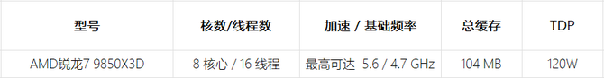 锐龙7 9850X3D 处理器拥有 8 个高性能核心/16 线程,针对游戏负载的最高效率进行了优化,可提供超低延迟和卓越的帧率表现。其加速频率高达 5.6 GHz,总缓存容量高达 104MB,能够确保在运行当今游戏大作、直播以及处理后台应用间切换时享受丝滑顺畅的应用体验。