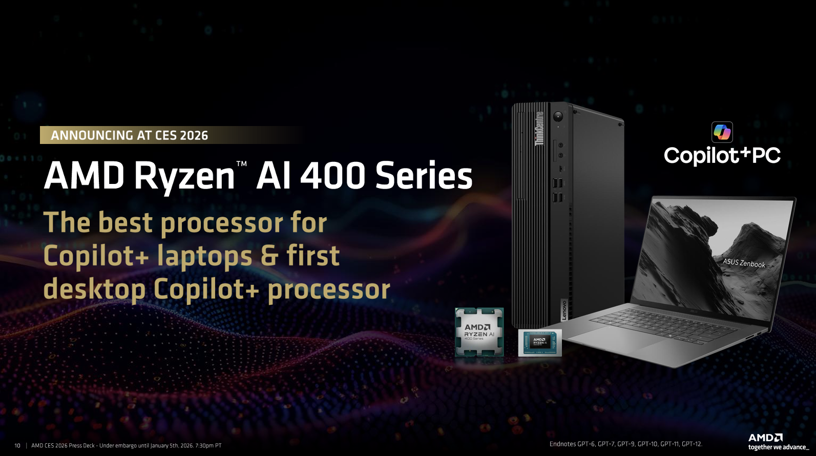 • AMD 推出全新锐龙 AI 400 与 PRO 400 系列处理器,为 Windows 11 AI+ PC 与消费及商用系统 AI 体验带来至高可达 60 TOPS的NPU。