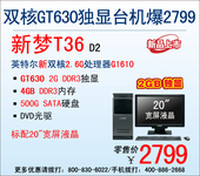 新梦T36是一款商务、娱乐两用的高性价比台机,一度凭借自身超强性能和实惠的价格博得消费者的亲睐。然而,这款台式电脑近日版本再度升级,新升级的新梦T36 D2将CPU更换为英特尔双核2.6G处理器G1610,显卡升级为GT630 2G DDR3独显,配合充足的4G内存使得其各方面性能都有了显著提升,特别是3D图形性能方面更是尤为显著!此外,500GB的硬盘和20"宽屏液晶显示器等配置能让用户获得更为优越的使用体验。
