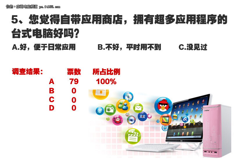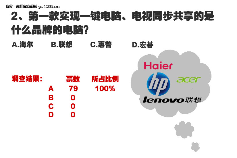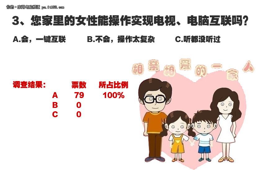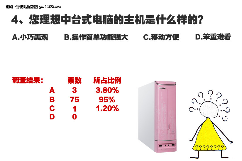 不想客厅出现绊马索、盘丝洞?要罢黜客厅电脑,全面解放客厅空间?要智能一键解决方案?美女终极家用PC设想是什么?针对这些问题,我们在网友中进行了一次问卷调查,下面就来看看调查结果吧!有意想不到的惊喜哦。