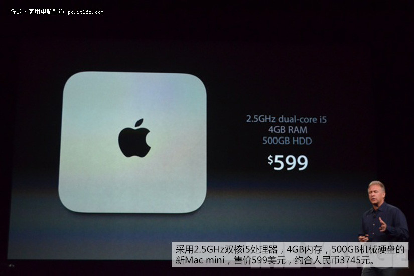 采用2.5GHz双核i5处理器,4GB内存,500GB机械硬盘的新Mac mini,售价599美元,约合人民币3745元。