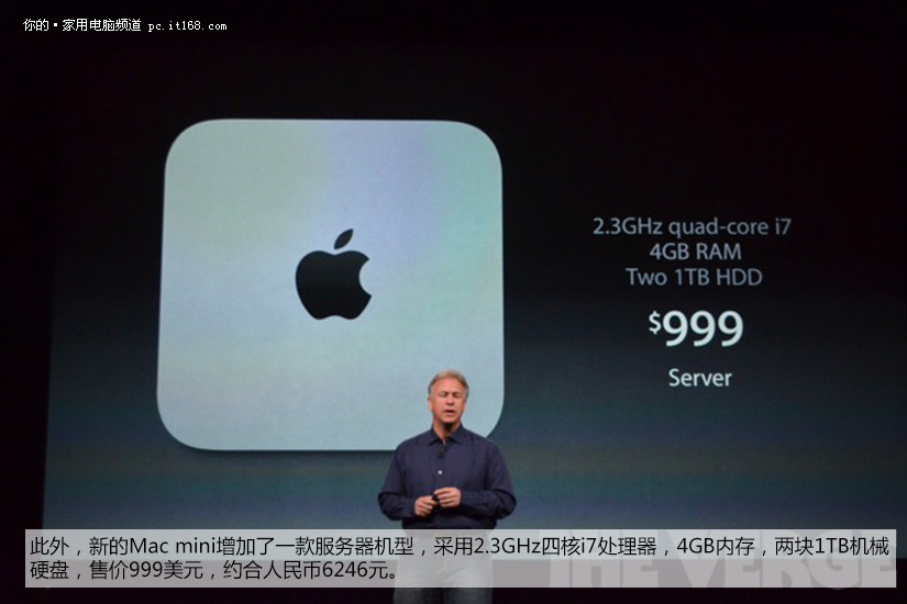 此外,新的Mac mini增加了一款服务器机型,采用2.3GHz四核i7处理器,4GB内存,两块1TB机械硬盘,售价999美元,约合人民币6246元。