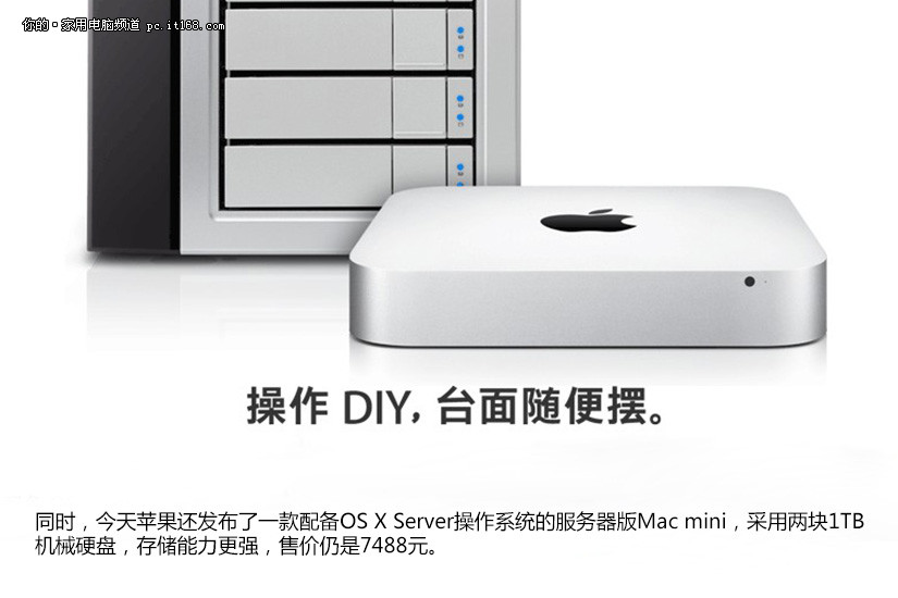 同时,今天苹果还发布了一款配备OS X Server操作系统的服务器版Mac mini,采用两块1TB机械硬盘,存储能力更强,售价仍是7488元。