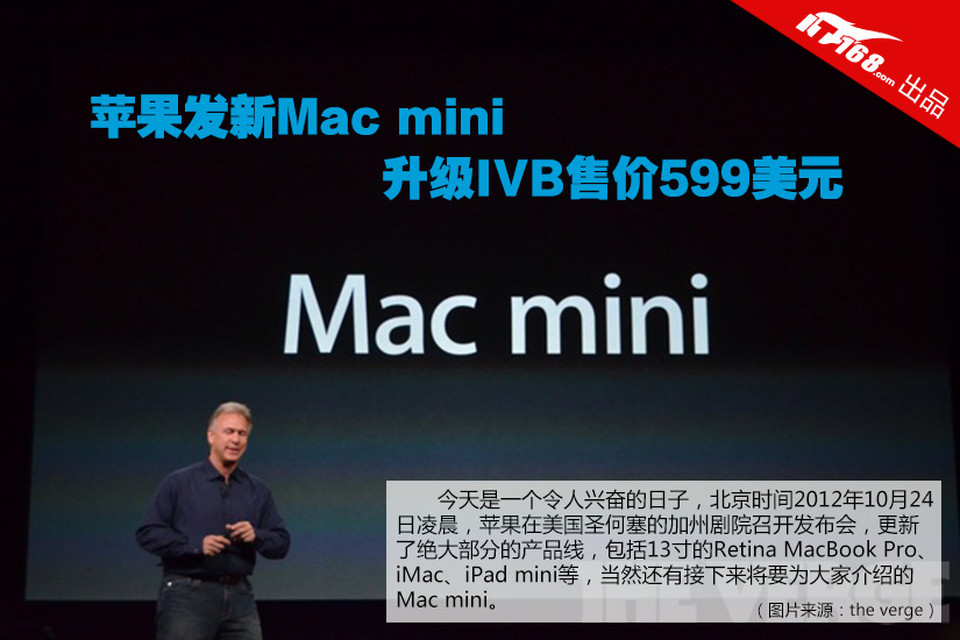 今天是一个令人兴奋的日子,北京时间2012年10月24日凌晨,苹果在美国圣何塞的加州剧院召开发布会,更新了绝大部分的产品线,包括13寸的Retina MacBook Pro、iMac、iPad mini等,当然还有接下来将要为大家介绍的Mac mini。