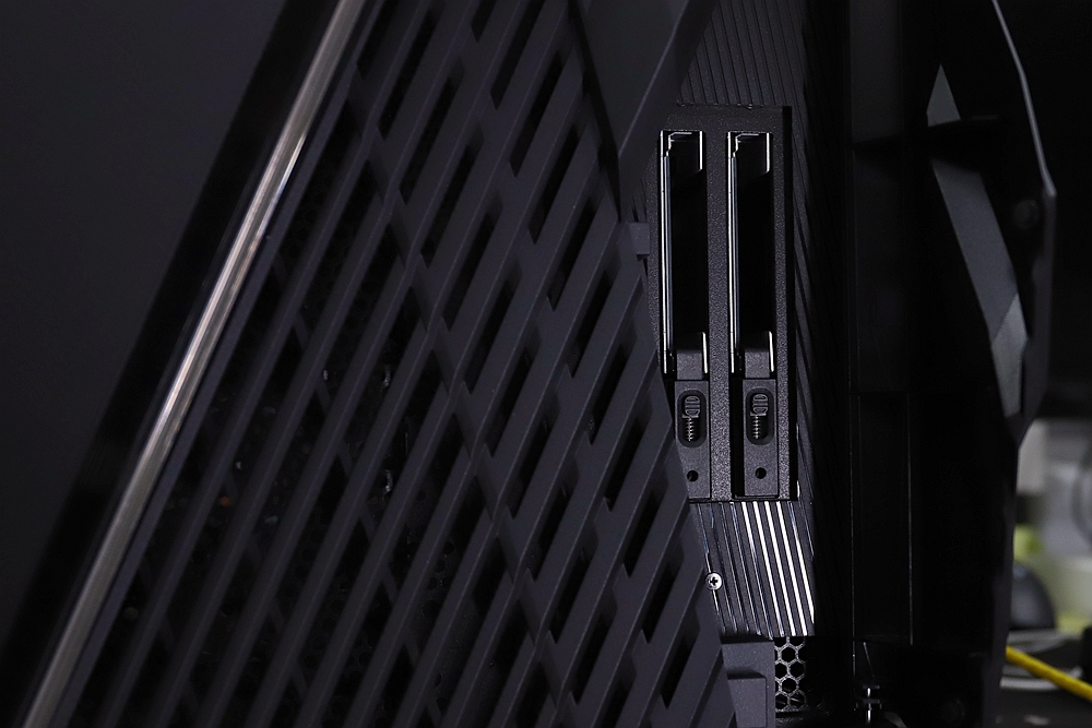 右侧斜梯状的面板下还隐藏了两个快拆机械硬盘位,用于容量的扩展,这对于职业玩家、设计师、视频剪辑等对大容量存储空间的用户非常有用。