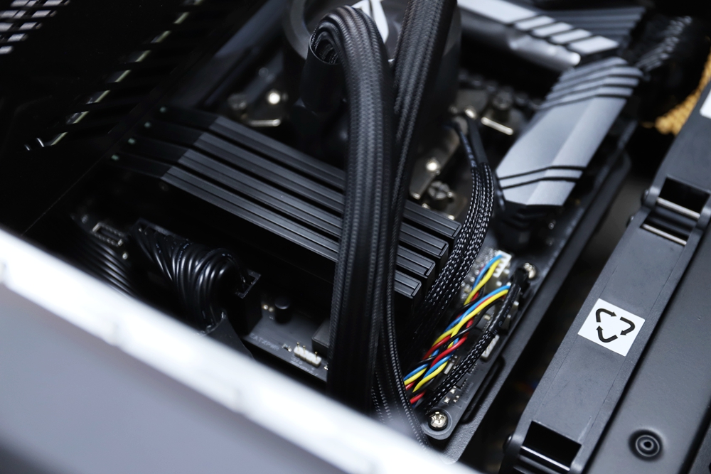 机箱内部采用了腔室分隔的解决方案,所以整个机箱看上去很宽体,布局合理,走线规整,这样做的好处也是显而易见,毕竟要想发挥高端硬件的全部潜能,必须要有充足的散热空间,所以我们看到锐龙9 3950X处理器采用了240mm水冷散热,GeForce RTX 2080Ti显卡上有三个散热风扇,机身后部和电源都有自己独立的空间和散热风扇,以及内存、硬盘都做了散热马甲,再加上机身大面积的散热格栅,所以这是一个经过特别优化设计的机箱,目的就是确保性能强力释放和长时间保持稳定运行。
