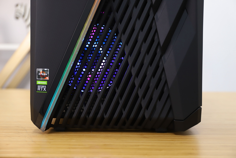 下部是散热栅格,可隐隐看到内部风扇的RGB灯效。